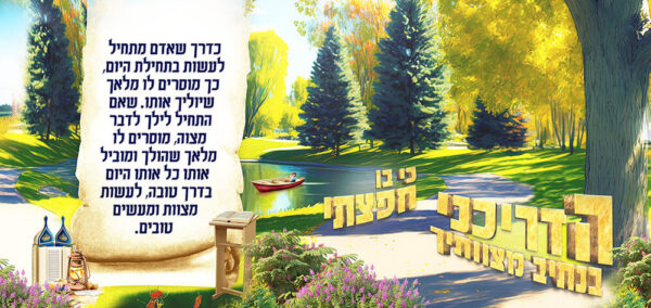 שביל רחב מתפתל בין עצים ירוקים, מזמין להיכנס ליום חדש מלא במשמעות. ברקע אגם שקט וסירה קטנה יוצרים אווירה רגועה, שמחברת בין המסלול הפיזי לדרך הפנימית שכל אחד בוחר לעצמו. לצד הדרך, טקסט מעורר מחשבה על תחילת היום וההשפעה שלה על ההמשך, מזכיר לנו שהצעד הראשון חשוב לא פחות מהמסע כולו. בתוך כל זה, בקשה מה' שידריך אותנו בדרך הטובה, יכוון את צעדינו אל מסלול של תורה ומצוות, אמת, חסד ומשמעות. הקיר משלב בין נוף פסטורלי למסרים של הכוונה וצמיחה, ויוצר מרחב שמזכיר שתמיד יש דרך טובה ללכת בה.